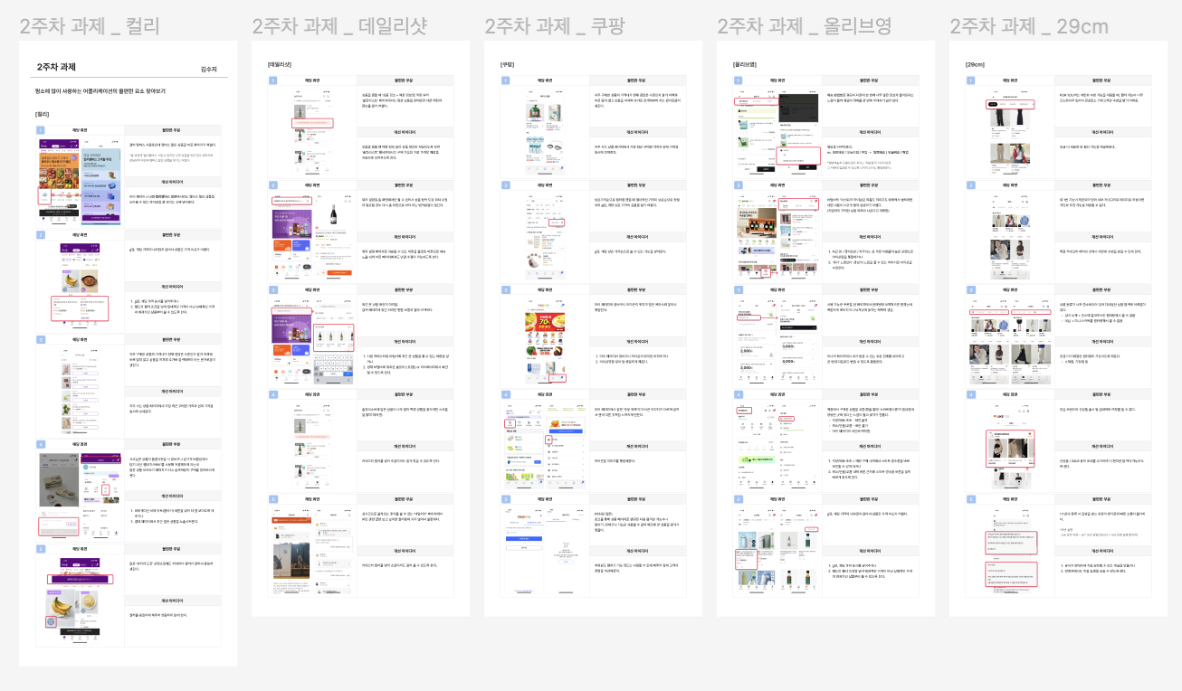 2주차 과제를 전부 업로드했다. 평소 자주 사용하는 앱 5개를 골라 불편한 요소 + 개선 아이디어를 정리하는 과제였다. 각 앱당 5가지씩 불편함을 정리해야 하기 때문에 총 25가지를 정리해야 했다. 나는 애초에 사용성이 떨어진다고 느껴지면 앱을 삭제해 버리기 때문에, 자주 쓰는 앱들에서 불편함을 5가지씩이나 찾아낼 수 있을까? 생각했지만 가능했다. ㅎㅎ 소재를 찾는 건 어렵지 않았는데 캡쳐할 게 많아서 정리하는 데 대부분의 시간이 걸렸다.