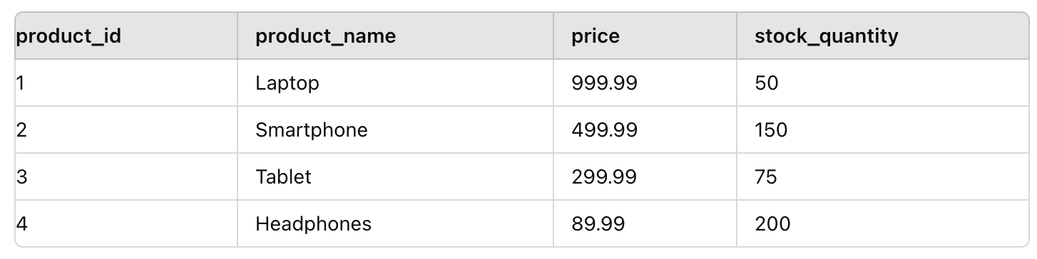 수정된 답변 : CREATE TABLE products (product_id INT, product_name VARCHAR(50), price DECIMAL(10,2), stock_quantity INT);